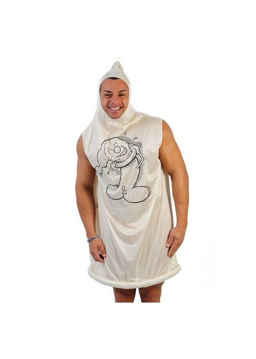 Incluye el disfraz de preservativo de una sola pieza.